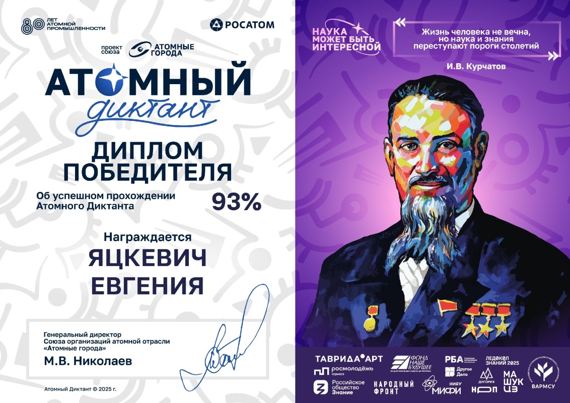 Атомный диктант – ежегодный международно-просветительский проект, организуемый Союзом «Атомные города» при поддержке Госкорпорации «Росатом» с целью популяризации научных знаний и повышения общественного интереса к вопросам атомной энергетики, экологии, безопасности и истории атомной отрасли. С 1 по 14 сентября студенты приняли онлайн-участие, проверили свои знания об атомной отрасли в рамках просветительской акции «Атомный диктант». Проект, организованный Союзом «Атомные города» при поддержке Госкорпорации «Росатом», уже пятый год подряд знакомит участников с достижениями российской науки и технологий.