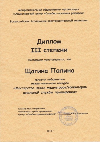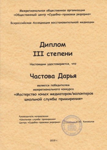 В период с марта по июнь 2019 г. волонтеры-медиаторы колледжа участвовали в межрегиональном конкурсе «Мастерство юных медиаторов/волонтеров школьной службы примирения» (г. Москва) – заняли почетное 3 место (Диплом 3 степени). Участвовали в таких номинациях: эссе "Почему я примиряю друзей", опыт проведения восстановительной программы "Круг сообщества на тему "Поговорим о дружбе", "Трудный возраст взросления", а также участвовали в обобщении опыта работы Службы примирения колледжа.