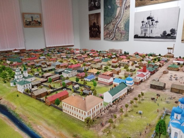Далее мы отправились в Рыбинск в небольшой музей Мологского края, большая часть которого была затоплена в 1940-х годах в результате создания Рыбинского водохранилища. В зоне затопления оказались старинный русский город Молога и более 700 сёл и деревень, а с ними — множество замечательных памятников истории и культуры. Всех без исключения впечатлил макет затопленного города. Выставка «Неизвестная Молога – Русская Атлантида» (макет города Мологи) находится в здании «Мучного гостиного двора» на Волжской Набережной. Эта выставка как будто «оживляет» Мологу, поскольку на её архитектурно-историческом макете представлены движущиеся объекты (фигуры людей, речные суда, повозки с лошадьми), световые и звуковые эффекты (гул площади в базарный день, звон колоколов). Экскурсовод нам рассказал, что все объекты макета (их около 400) созданы в масштабе 1:100 по фотографиям, планам, чертежам, личным воспоминаниям мологжан. Мы наглядно увидели быт мологжан.